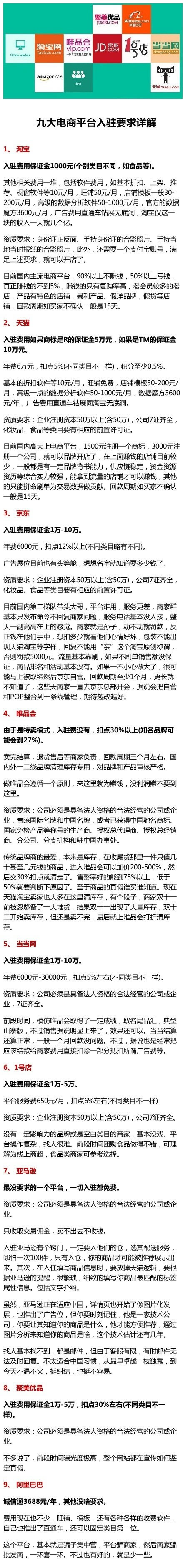 ①淘寶,保證金1000元 ②天貓,商標(biāo)R保證金5萬,TM的10萬 ③京東,保證金1萬-10萬,年費6000元 ④唯品會,0入駐費,扣點30% ⑤當(dāng)當(dāng),保證金1萬-10萬 ⑥1號店,保證金1萬-5萬 ⑦亞馬遜,入駐免費,只收交易傭金 ⑧聚美優(yōu)品,保證金1萬-5萬 ⑨阿里巴巴,誠信通3688元/年。