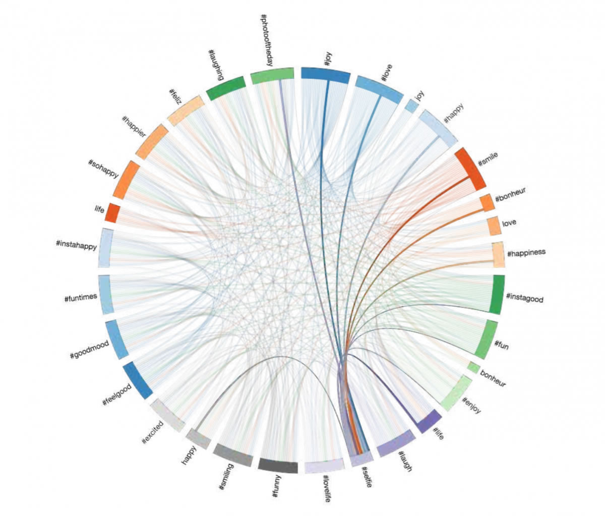 關鍵詞關系圖,其中多個與“愉悅感”相關的詞匯(如”微笑“”快樂“)都聚集至“selfie”