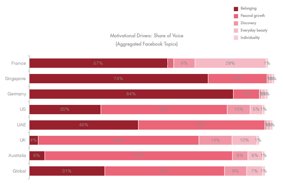 各地區話題占比一覽,由深至淺分別是歸屬感、個人成長、探索發現、美容健體、個性與獨立,從上至下是法國、新加坡、德國、美國、阿聯酋、英國、澳大利亞及全球