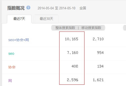 為什么50+seo指數這么高?因為50和seo的指數疊加了,舉個例子:seo+協會+網這個詞: