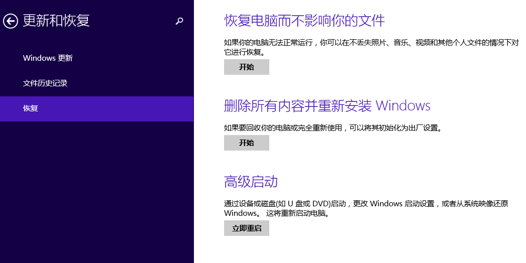 至此,完成系統(tǒng)恢復(fù)或者重裝,不需要外置光盤,或者U盤這類安裝介質(zhì)(如果只是“恢復(fù)電腦而不影響你的文件”,可以使用安裝盤或者U盤引導(dǎo)盤)。
