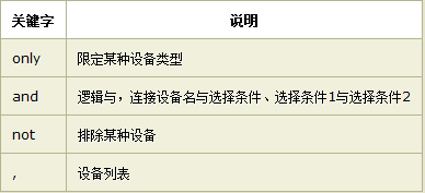 從上面的例子可以看出,字符間以空格相連,選取條件包含在小括號內,srules為兼容設置的樣式表,包含在中括號里面。only(限定某種設備,可省略),and(邏輯與),not(排除某種設備)為邏輯關鍵字,多種設備用逗號分隔,這一點繼承了css基本語法。