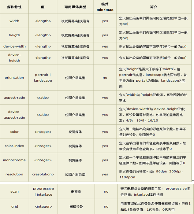 上面使用中only可省略,限定于計算機顯示器,第一個條件max-width是指渲染界面最大寬度,第二個條件max-device-width是指設備最大寬度。