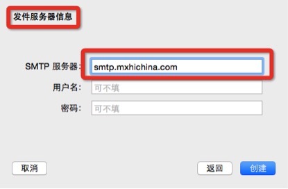 第七步:填寫發信服務器地址,郵箱用戶名和密碼,點擊【創建】。