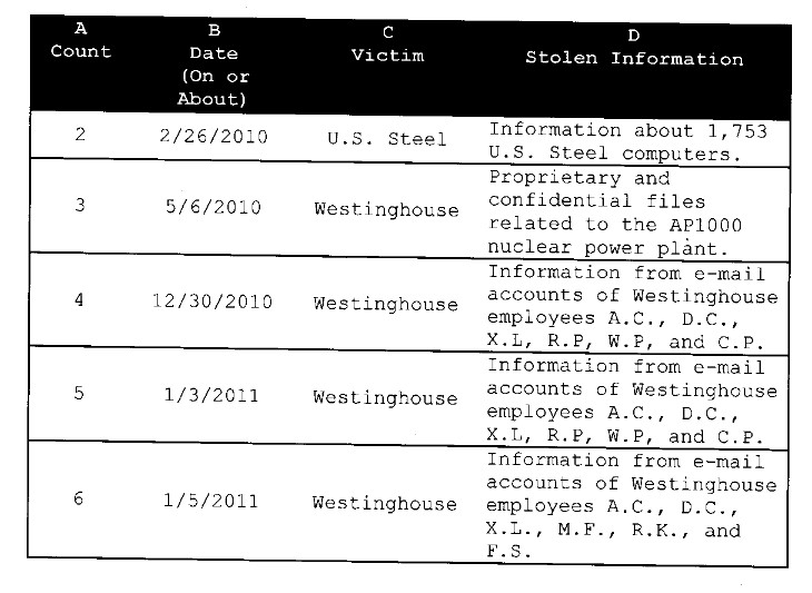 美國司法部認(rèn)為有必要起訴的理由是認(rèn)為這個刺探行動超越了他們“給自己劃定”的軍事、政治領(lǐng)域,而將刺探的信息用于經(jīng)濟(jì)目的。在起訴書中大量列舉了受害者的失竊信息,我猜想他們都應(yīng)該向FBI報案了。