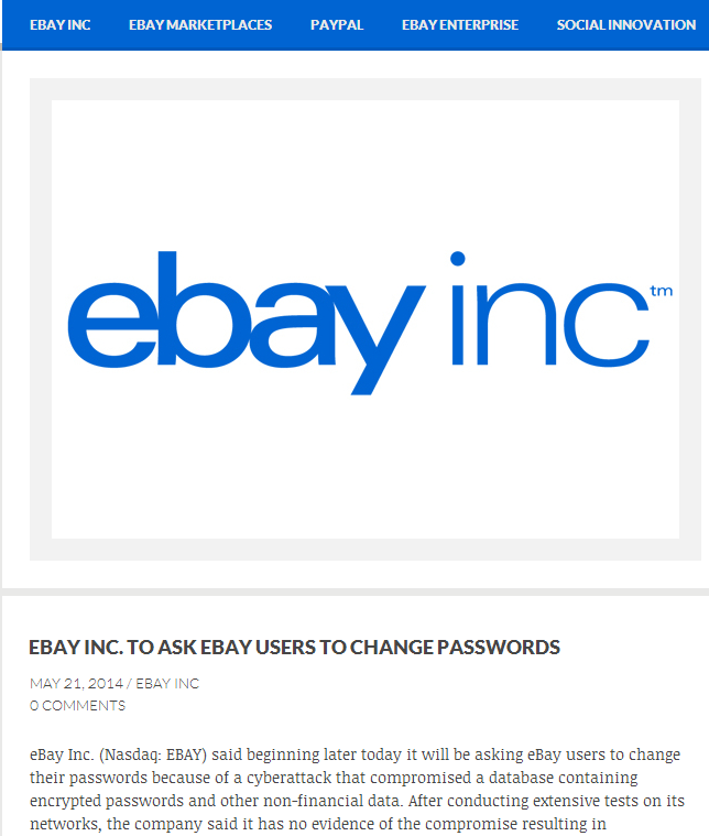eBay于5月21日在官方博客緊急發布公告坦言,今年2月底到3月初時,用戶數據庫遭駭,這個數據庫內有eBay顧客姓名、加密過的密碼、實體住址、電話和生日等個資,以及其他非金融相關的信息(不含信用卡等金融信息),也沒有機密性個人資料。